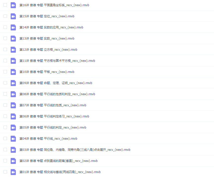 此课件来自傲德初一数学同步基础下学期视频课程,此课件主要知识点包括:相交线与垂线(两线四角)、点到直线的距离(垂直)、同位角、内错角、同旁内角(三线八角)点击展开、平行线、平行线的判定、平行线的性质、平行线的性质和判定、平方根与算术平方根等等视频课程。。。。