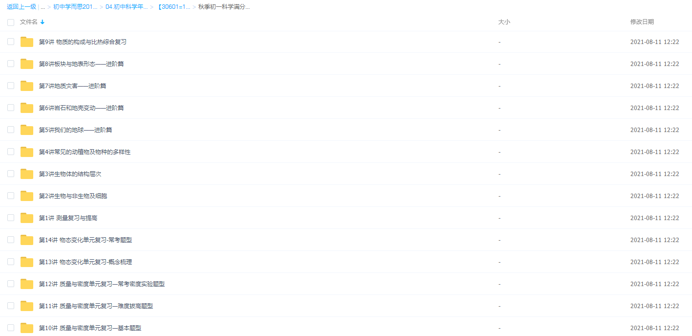 此课件来自学而思网校,秋季初一科学满分冲刺班(浙教版),包含视频课程和讲义资料 。此课件主要知识点包括:物质的构成与比热综合复习、板块与地表形态——进阶篇、地质灾害——进阶篇、岩石和地壳变动——进阶篇、物态变化单元复习等视频。