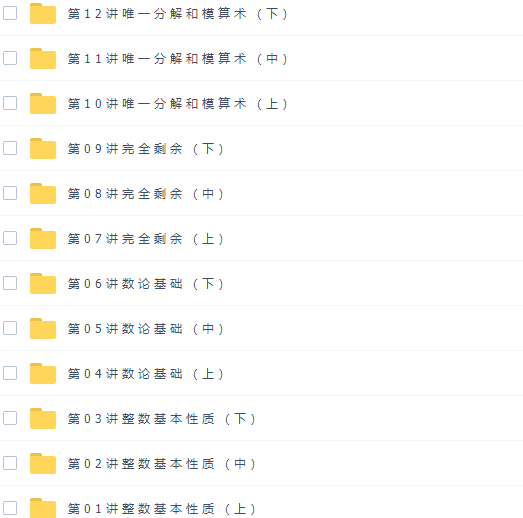 此课件来自学而思网校,高中奥数四阶高一全国高中数学联赛班陈晨完结。此课件主要知识点包括:整数基本性质、数论基础、完全剩余、唯一分解和模算术、不定方程、高斯函数、数论复习、均值柯西与排列、其他解不等式、不等式综合运用、向量、复数、组合。