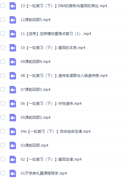 此课件来自猿辅导网校,张鹏高三生物课2021年秋季S班课程完结。此课件主要知识点包括:开学典礼暨课程导学、基因定律、自由组合定律、伴性遗传、遗传系谱图与人类遗传病、基因的本质、DNA的复制与基因的表达、生物变异、生物育种与生物进化、内环境与稳态、神经调节、体液调节、免疫调节、植物激素调节等视频。