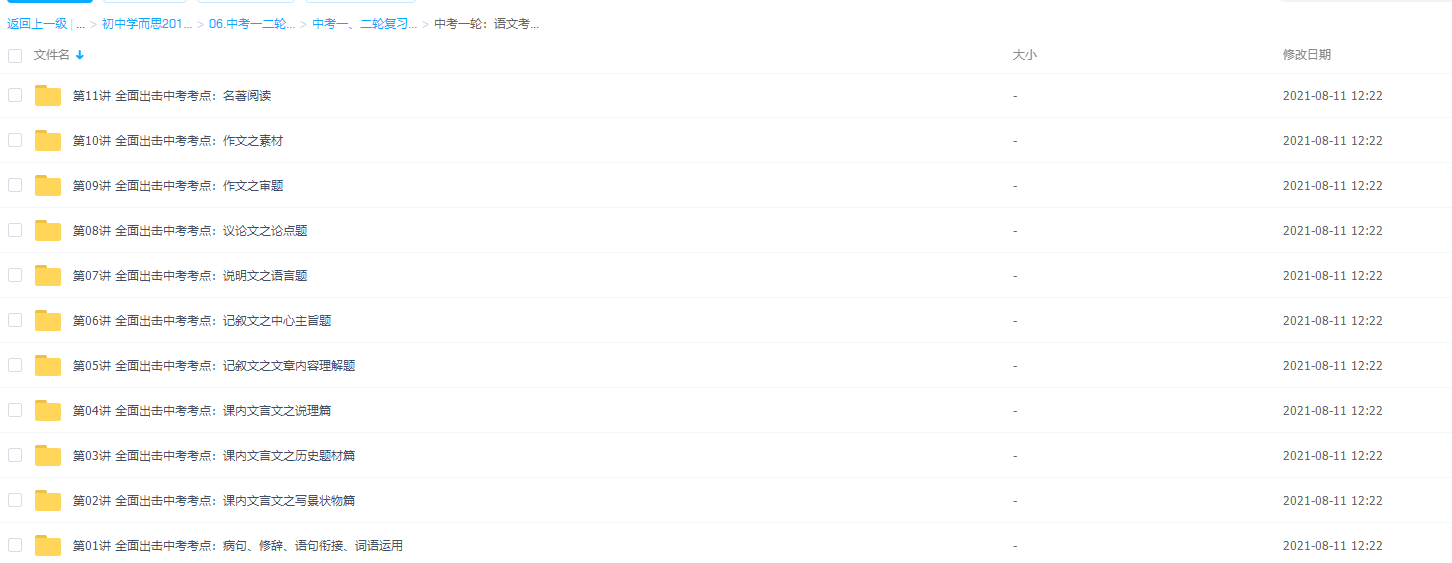 此课件来自学而思网校,中考一轮:语文考点拔高串讲班【王帆 11讲】,包含视频课程和讲义资料。此课件的主要知识点包括:病句、修辞、语句衔接、词语运用、课内文言文之写景状物篇、课内文言文之历史题材篇、课内文言文之说理篇、记叙文之文章内容理解题、记叙文之中心主旨题、说明文之语言题、议论文之论点题、作文之审题、作文之素材和名著阅读等视频