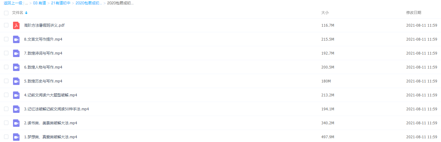 此课件来自有道精品课,2020包君成初中语文暑假高阶方法班,包含视频课程和讲义资料。此课件主要知识点包括:文言文写作提升、教煌诗词与写作、教煌人物与写作、教煌历史与写作、记叙文阅读六大题型破解、记忆法破解记叙文阅读50种手法、读书类,美景类破解大法等视频